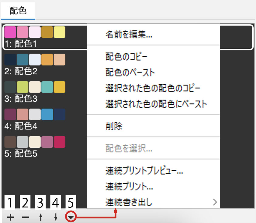下段の操作ボタンで配色を追加・削除・位置の移動「▼」メニュー または コンテキストメニュー(右クリック)から配色名の変更や配色のコピー&ペースト、配色の連続プリント、連続書き出し等が行えます。