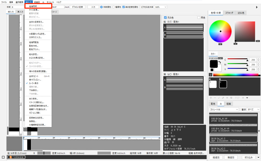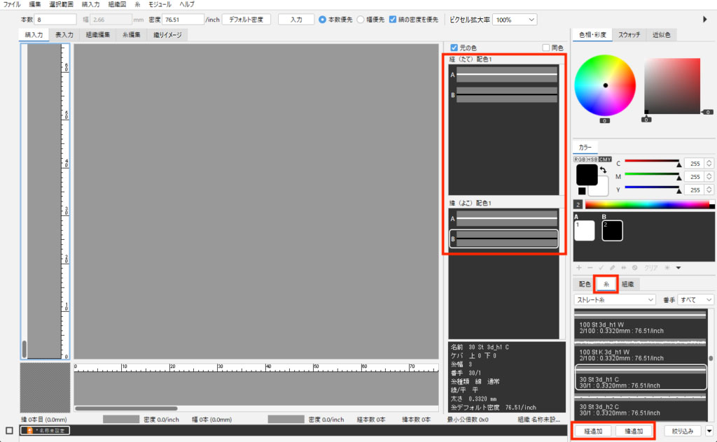 2. 糸リストから任意の糸を「経追加」「緯追加」ボタンで追加します。
