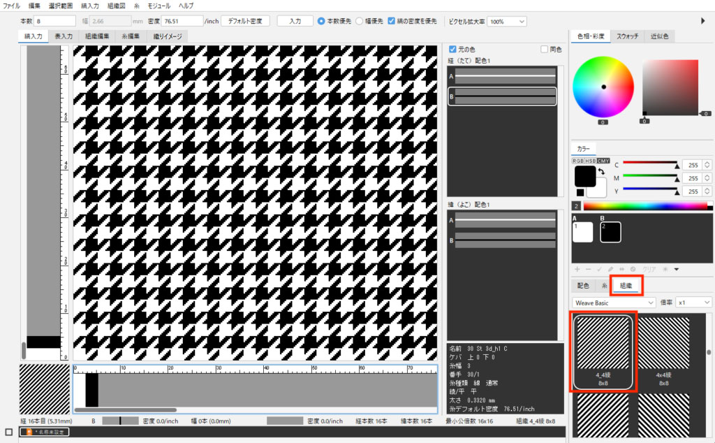 例1:白4本、黒4本の時は「2_2 綾 4×4」の組織を使用