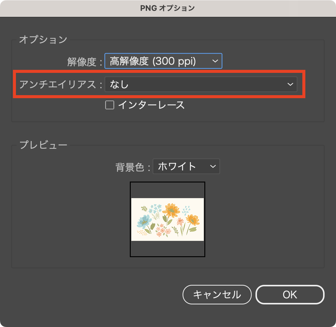 4. PNGオプションダイアログで「アンチエイリアス:なし」を設定し、「OK」をクリックします。