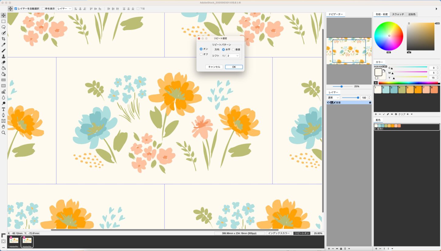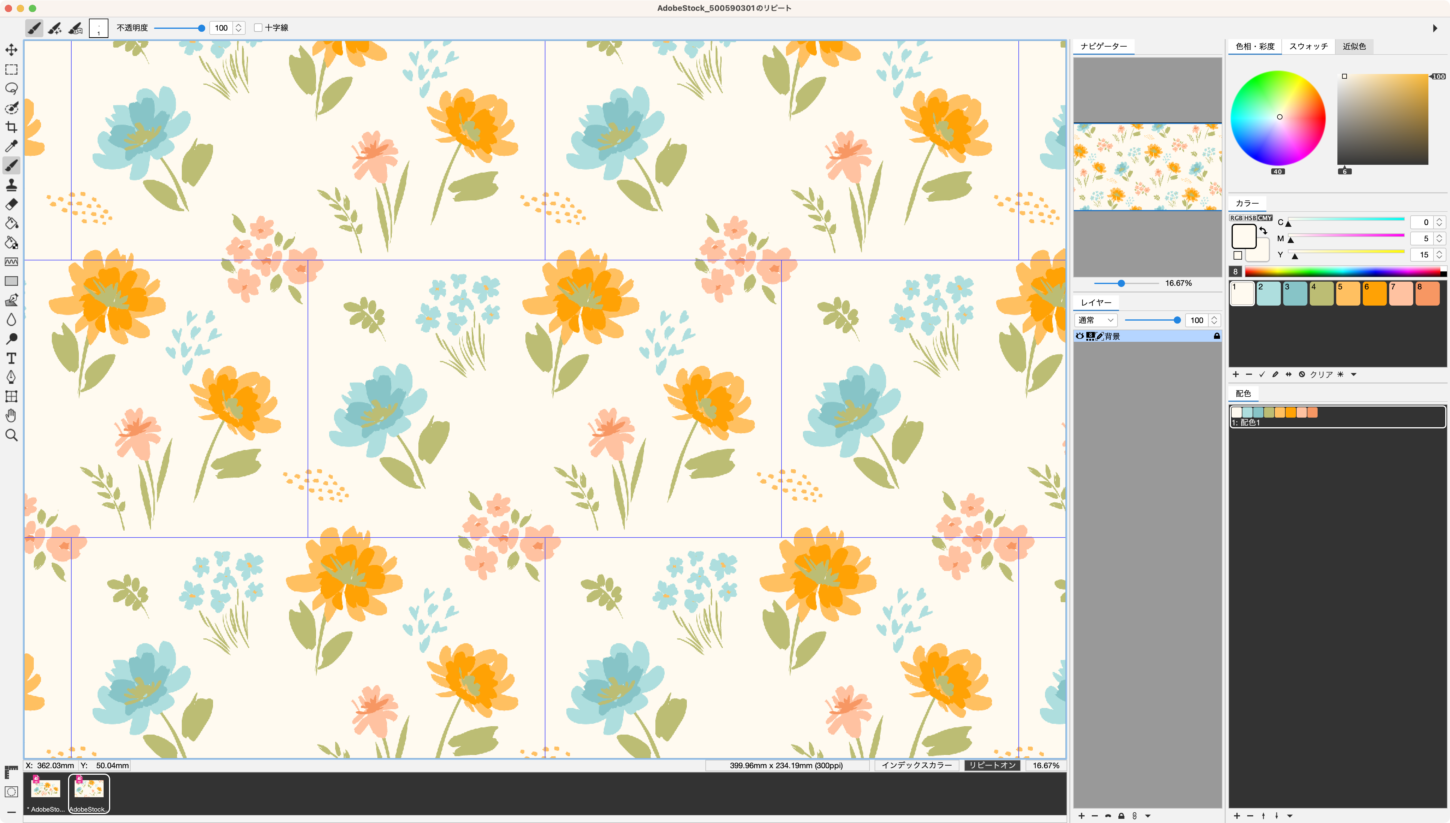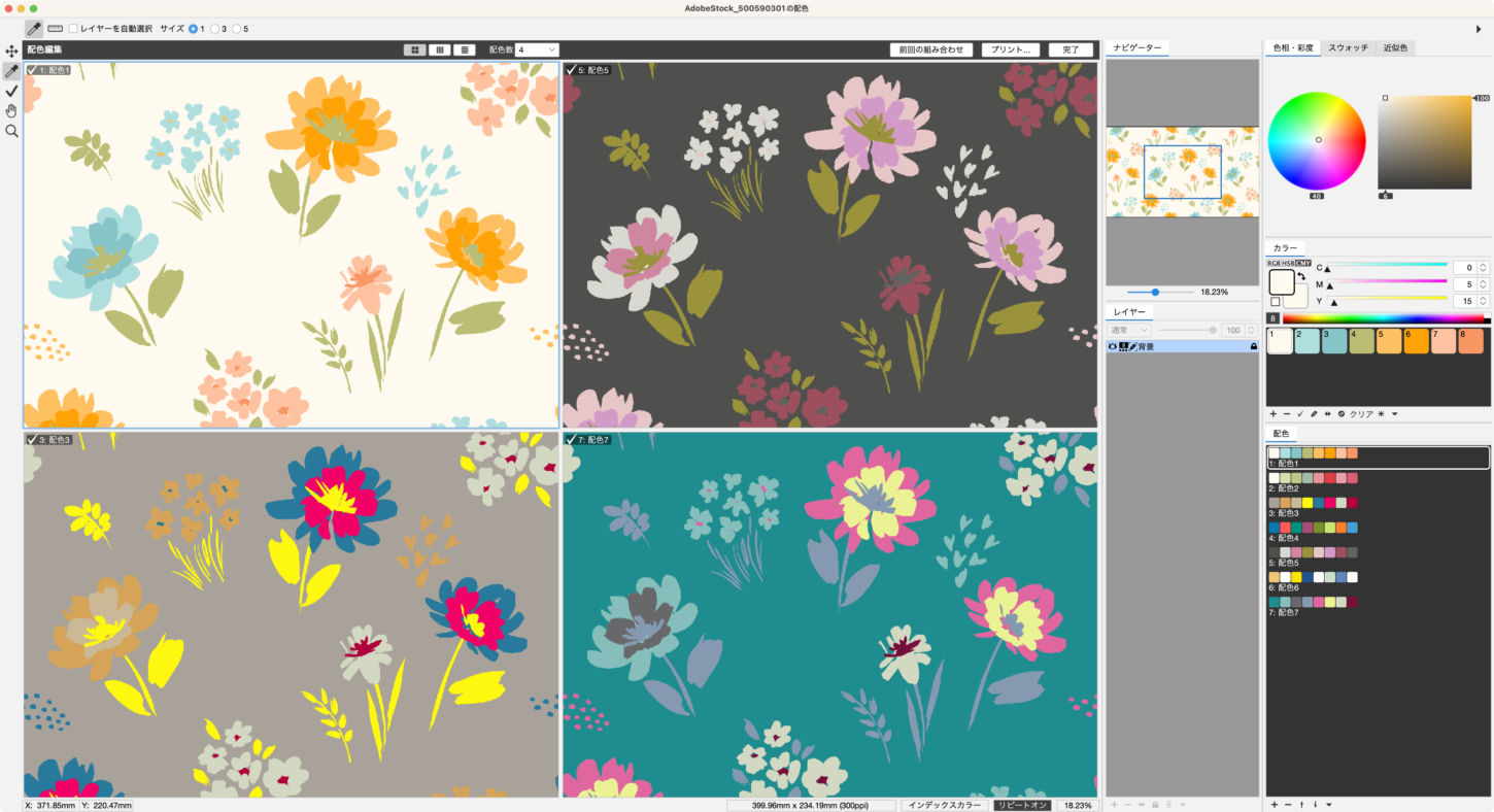 リピートの修正が終われば、配色の作成です。プリント図案の印象を大きく左右する配色を、効率的に、そしてバリエーション豊かに作成していきましょう。