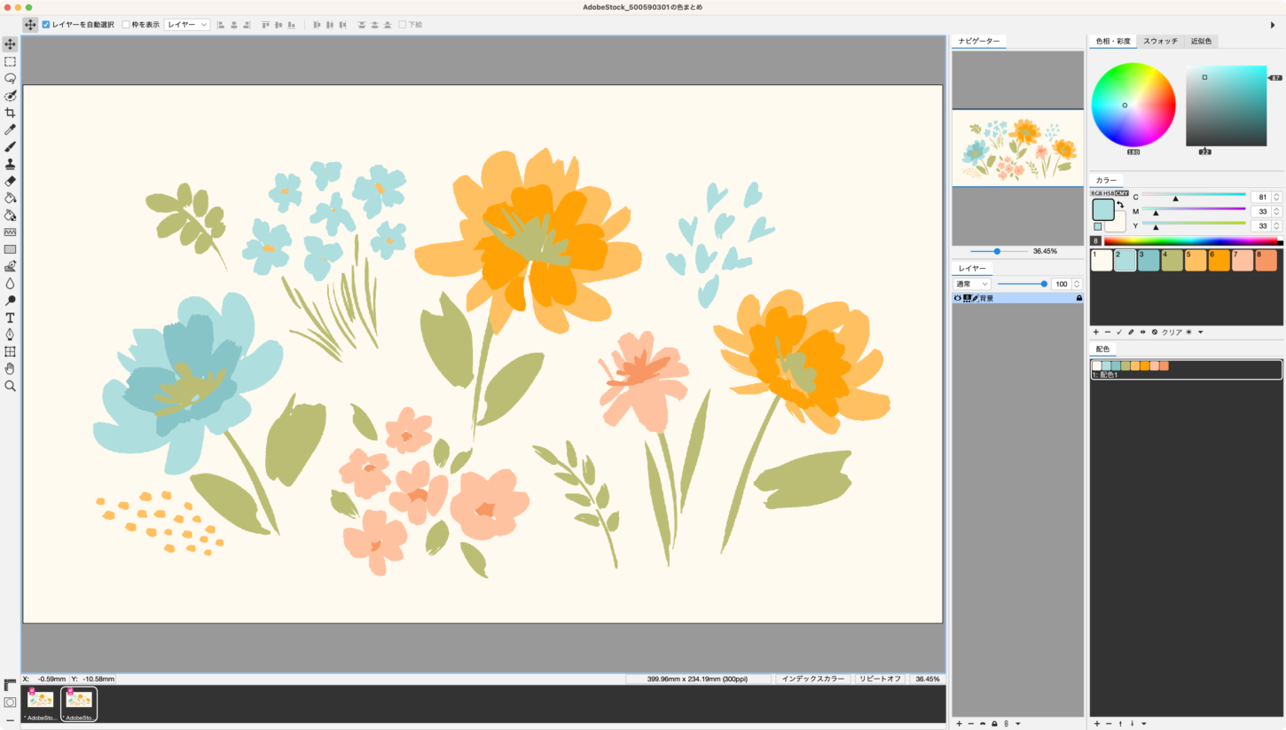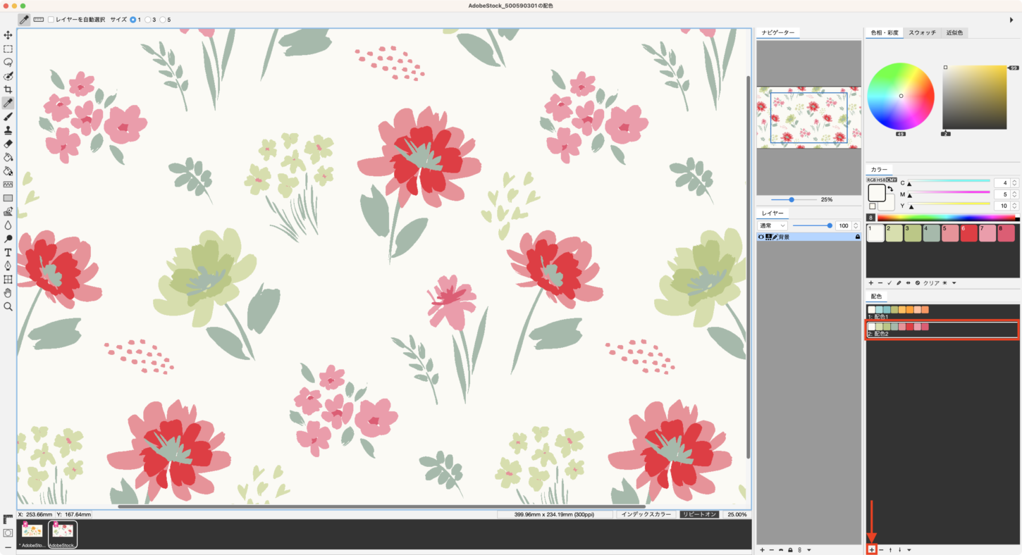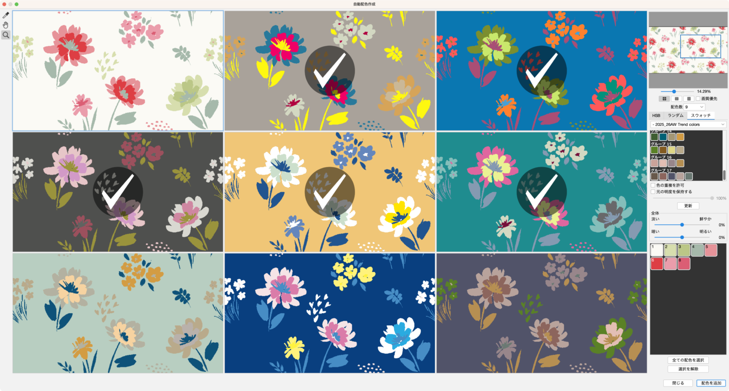 リピートの修正が終われば、配色の作成です。プリント図案の印象を大きく左右する配色を、効率的に、そしてバリエーション豊かに作成していきましょう。