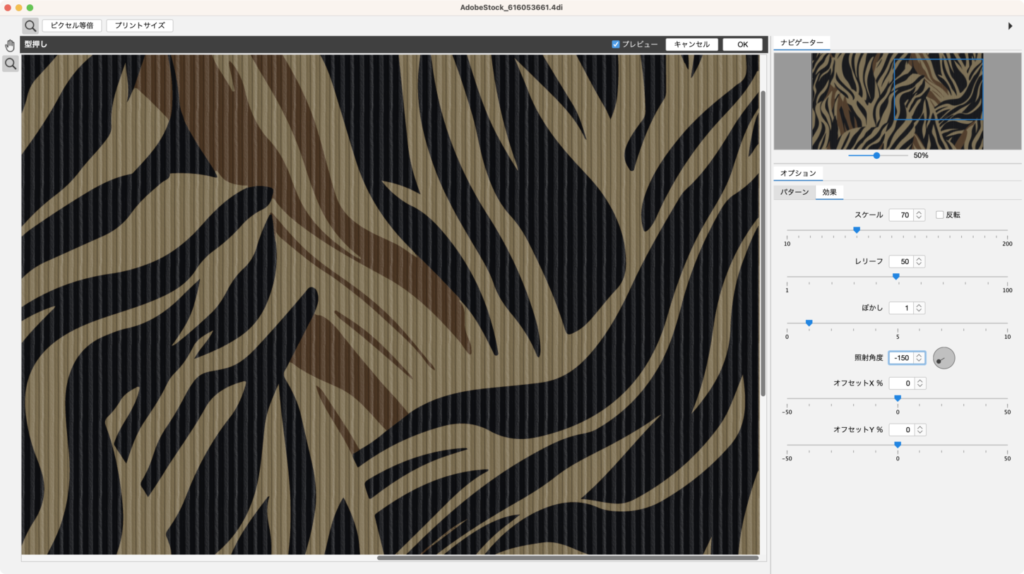 (本例では「stripe002」のパターンを使用しました。オリジナルパターンの登録方法はこちら) - パターンの大きさや影の方向などの効果を設定し、「OK」で型押しを完了させます。