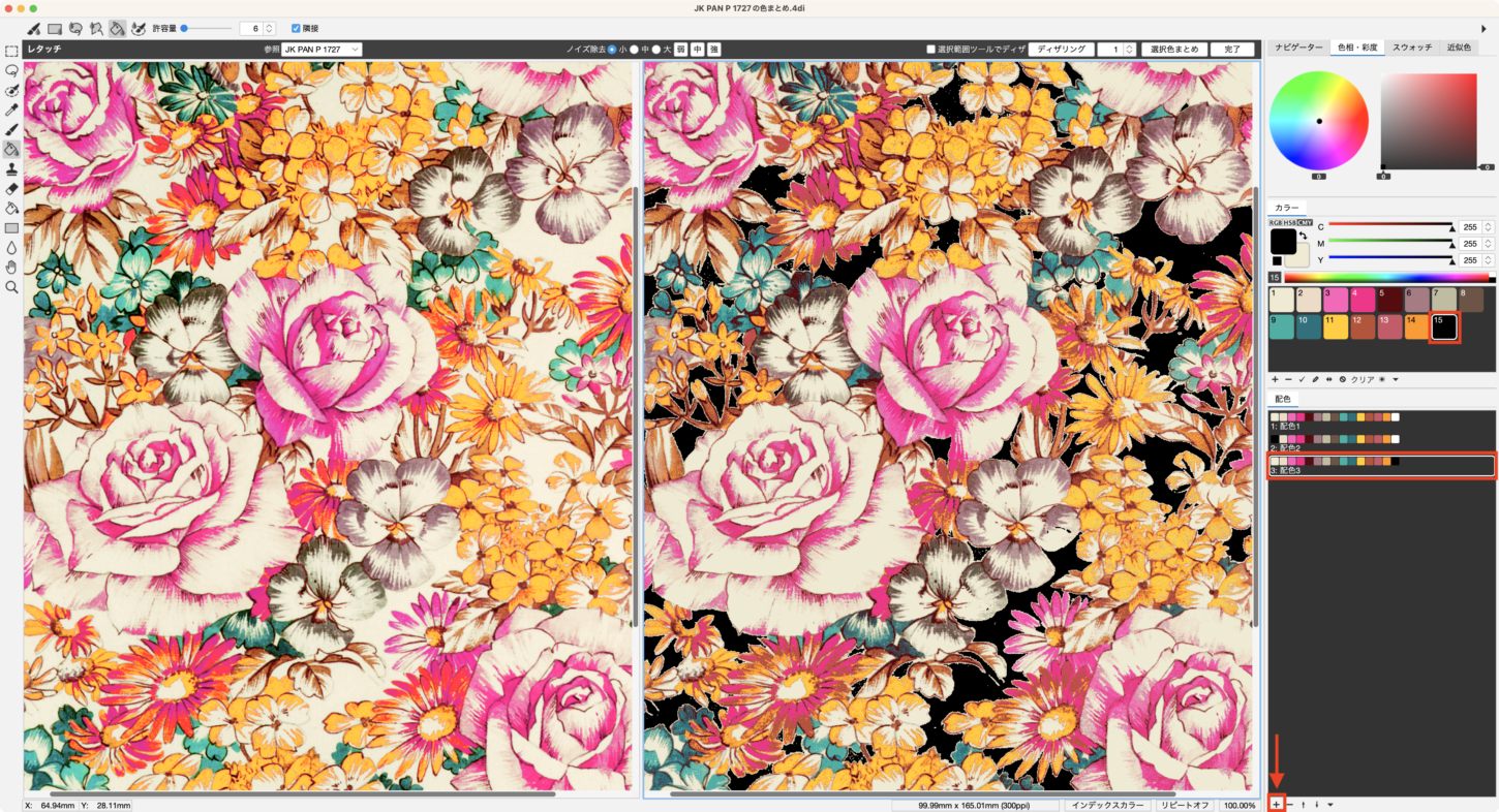 グランドの色を変更する際に、モチーフ(ここでは花)の色に意図せず影響が出てしまった場合に、それぞれの色を適切に修正する手順をご紹介します。