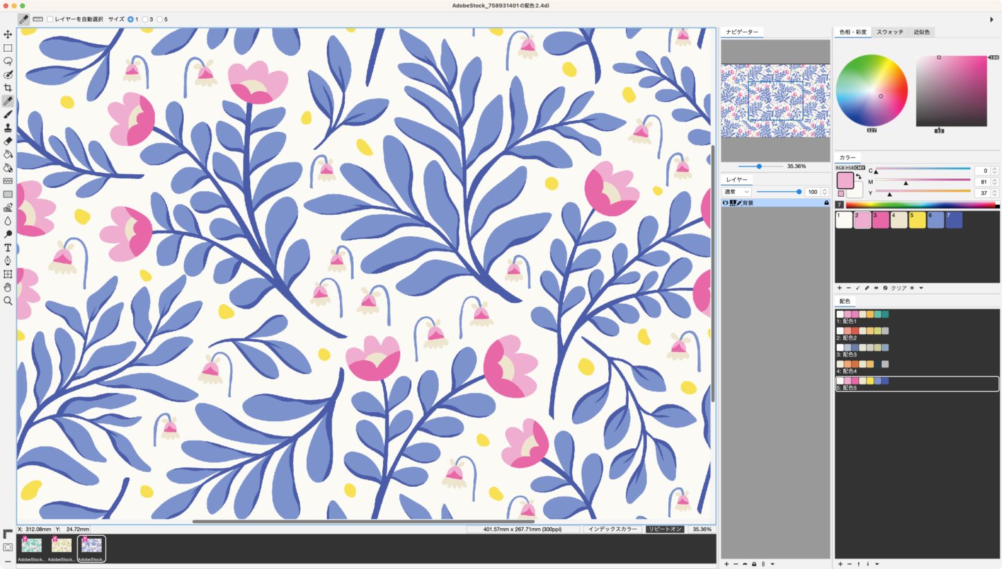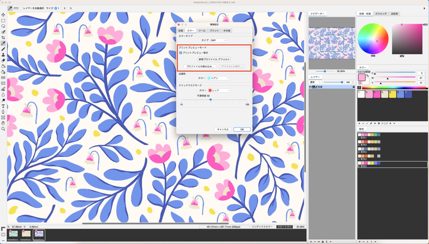 印刷プレビューモードを活用した色調整PLANSオリジナルまたは読み込んだICCプロファイルのCMYKが主体CMYKが主体他のアプリケーションの見た目には影響を与えません。プリンターの色再現域に近い見た目で作業が可能になり、視覚的に調整する際に役立ちます。