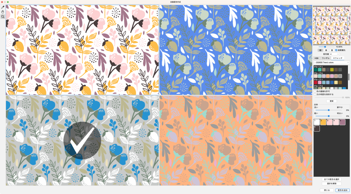 読み込んだスウォッチは、既存の色を置き換えたり、配色作成時のスウォッチとして活用したりすることで、トレンドカラーを取り入れたデザイン制作に役立ちます。