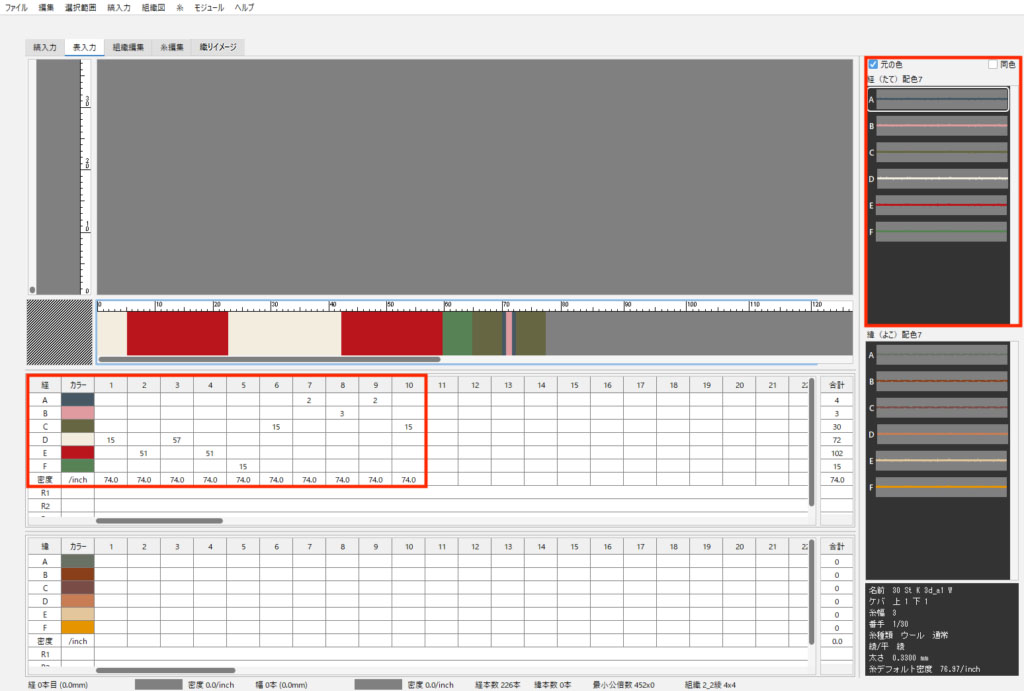 緯縞表から糸(A~F)のセルを選択し、本数を数値入力してEnter(Mac:return)で確定します。