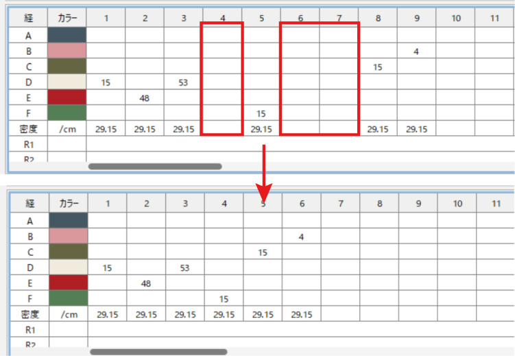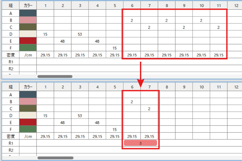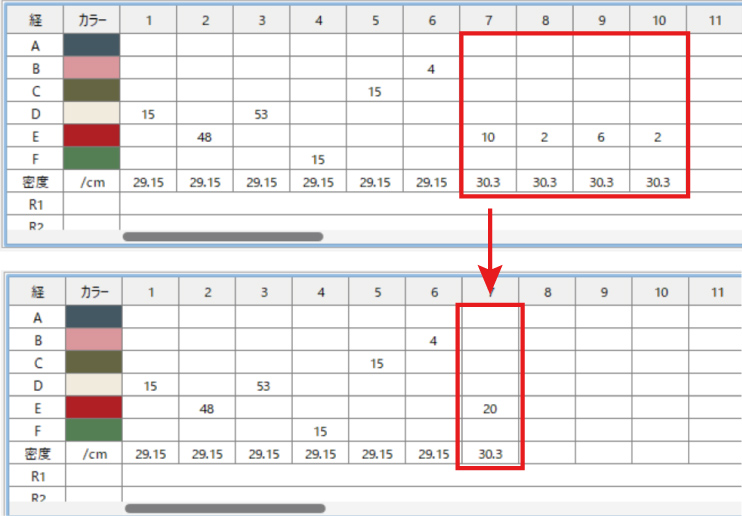 上書きする本数が同じ場合は、上書きしたい糸のセルをダブルクリックすると同数が入力されます。