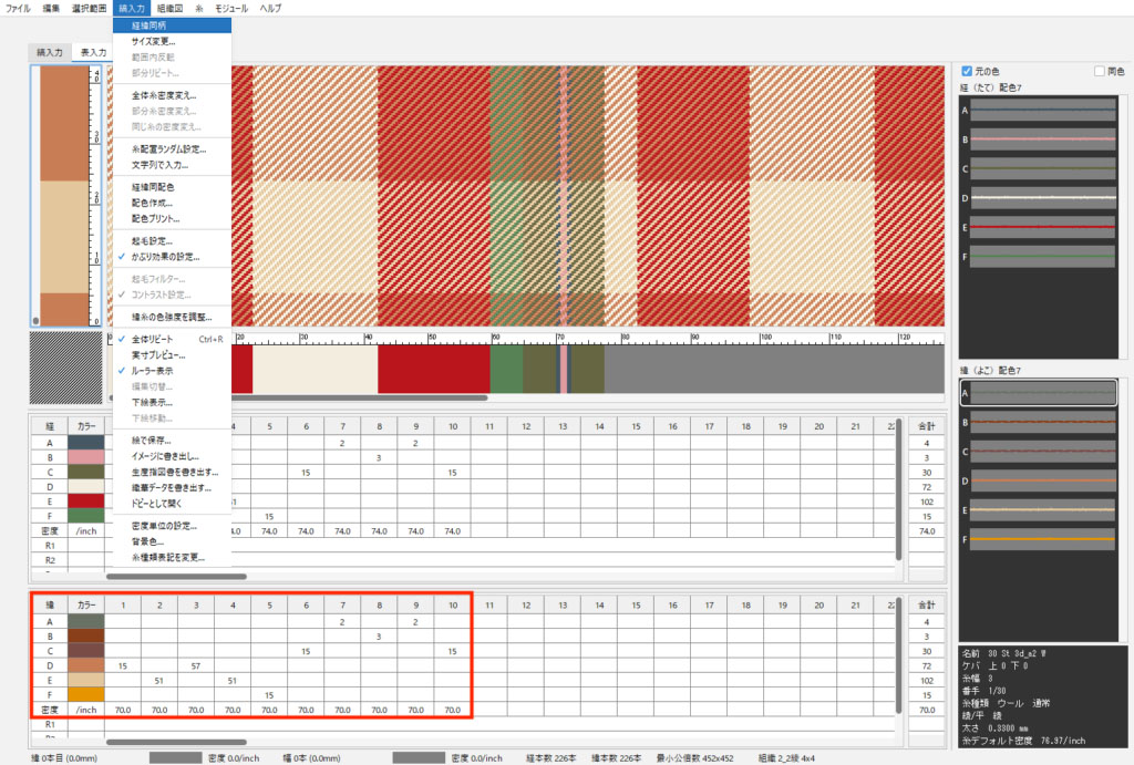 経緯の配列が同じであれば、縞入力メニュー>経緯同柄 を選択します。経縞と同じ配列が緯縞に配列されます。
