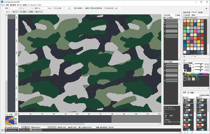 PLANSでは、地組織とドビー組織をそれぞれレイヤーとして、各レイヤーに組織を読み込んだり描画することで柄を作成します。レイヤーは5層まで色分けして編集可能です。縞入力は、レイヤーごとに分かれているタブを切り替えて、それぞれの層に縞を入力します。また、ドビー組織の機能を応用することで、ジャカード風のシミュレーションも作成できます。