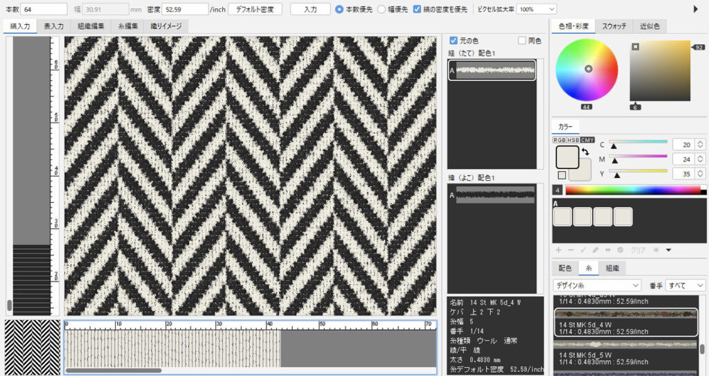 ベーシックなヘリンボーン柄は、経糸、緯糸1種類で表現します。 - 組織リストからヘリンボーン組織を選択します。